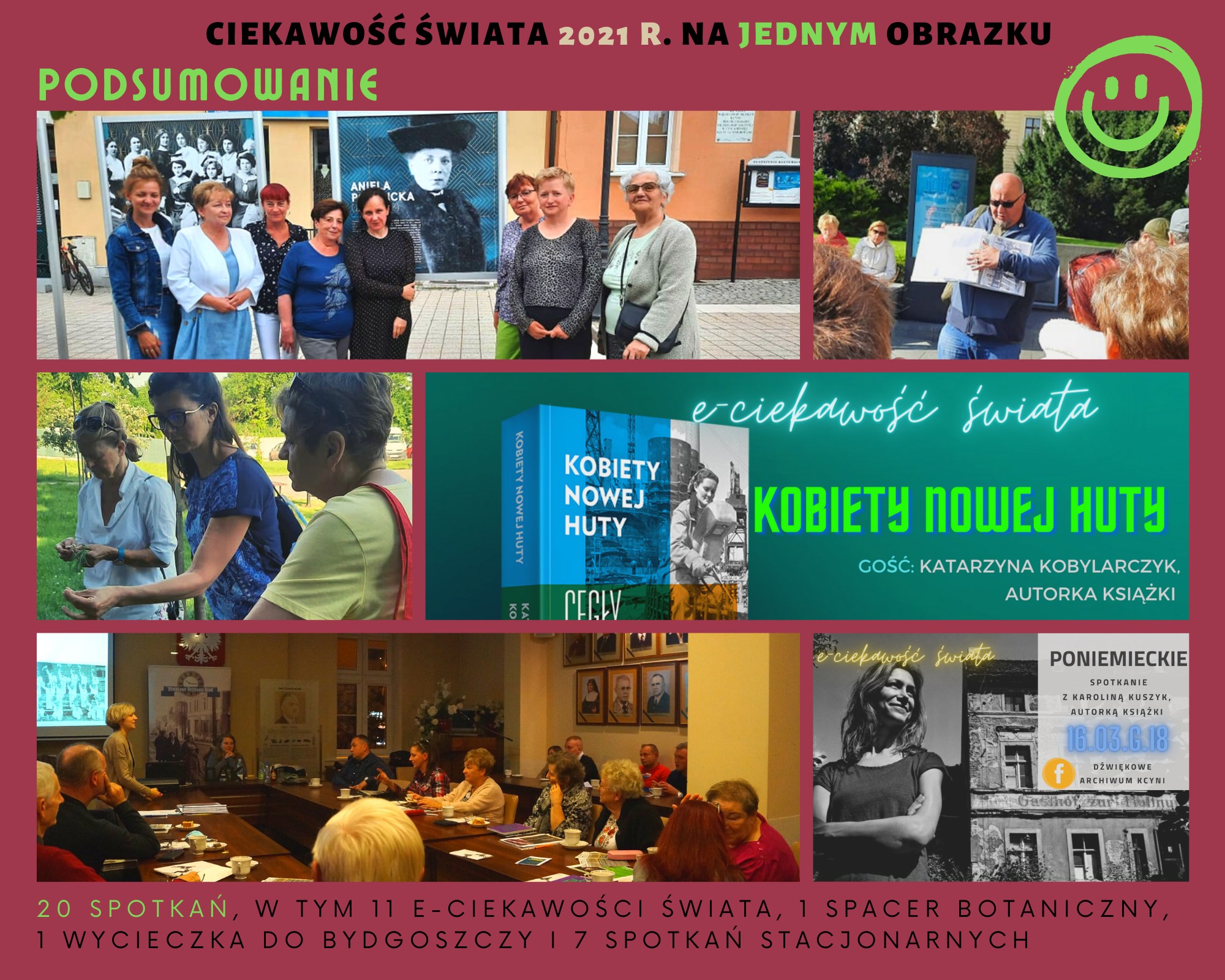 11 spotkań e-Ciekawości świata, 7 spotkań stacjonarnych (w tym warsztaty Zadbaj o pamięć, zadbaj o zdjęcia, organizowane przez Adrianę Kapałę i Małgorzatę Pankowską z Centrum Archiwistyki Społecznej) oraz 2 Ciekawości świata w plenerze – Spacer botaniczny z Polą Szymczak i wycieczka do Bydgoszczy pod przewodnictwem Damiana Amona Rączki.